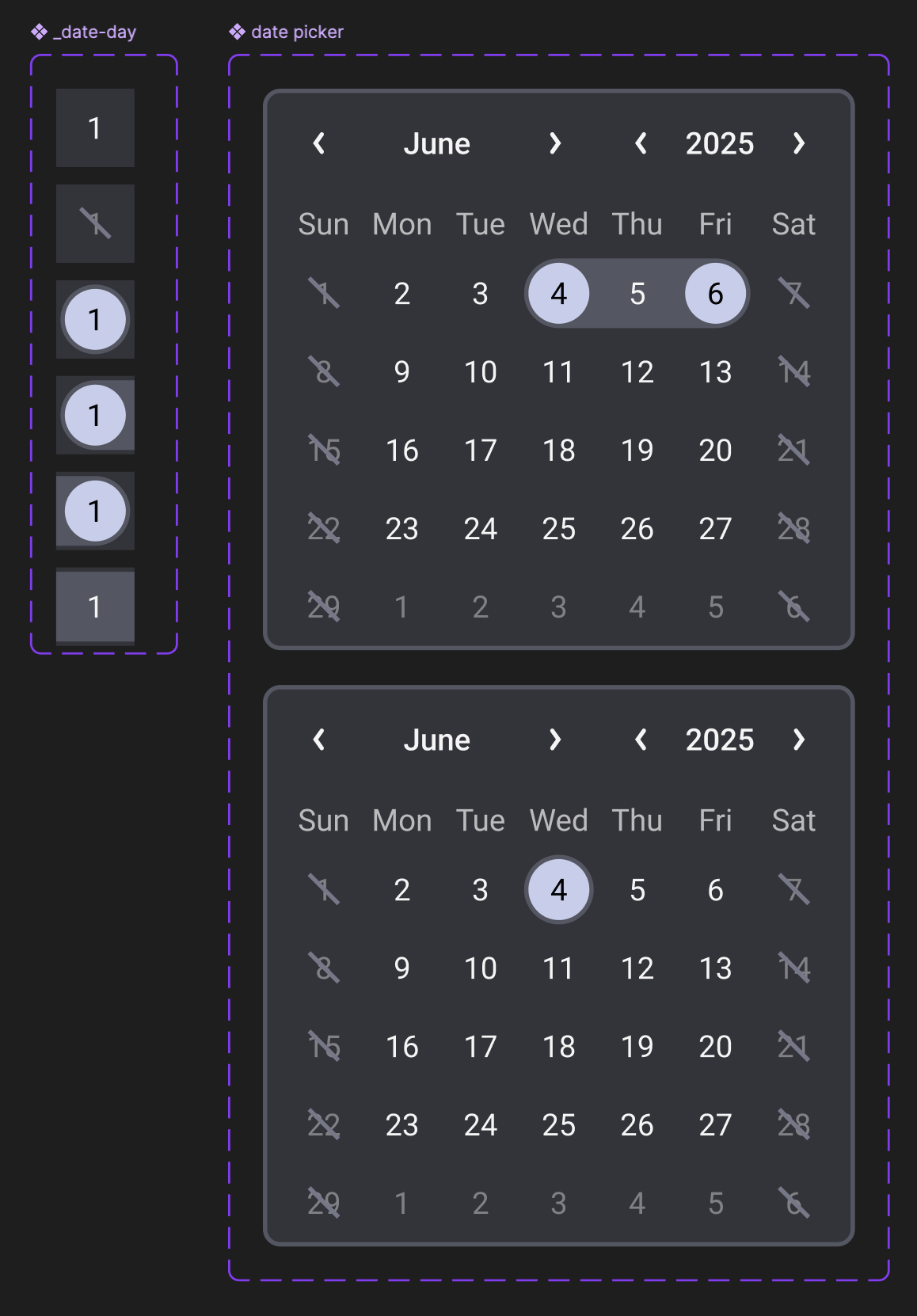 Now in some components you will need to have some predefined smaller parts to build them up, for example this custom date picker had a very specific structure where it was just bunch of day components added in a grind with some additional fields at the top: